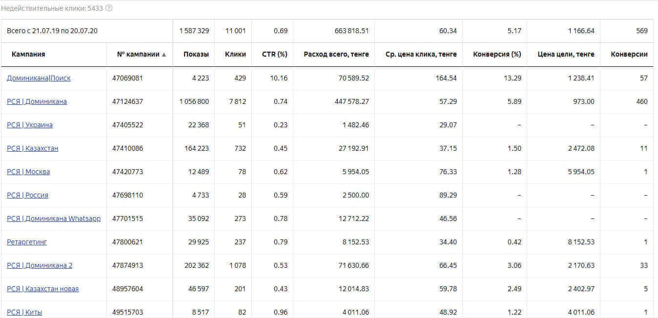 - • Затраты на рекламу 663 818 тенге (116 459 руб),средняя цена клика 60.34 тенге = 10.58 руб